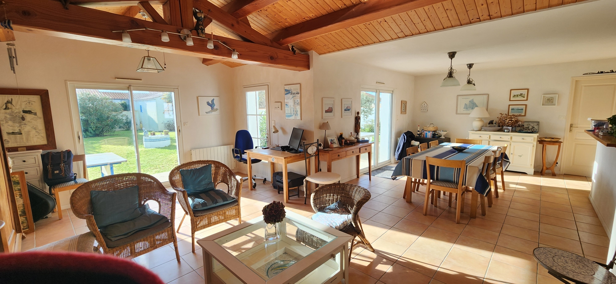 Située dans un environnement privilégié, au cœur du bourg et à quelques minutes à pied de la plage, cette élégante maison contemporaine de 2006 offre un cadre de vie raffiné, alliant confort, luminosité et prestations de qualité.
