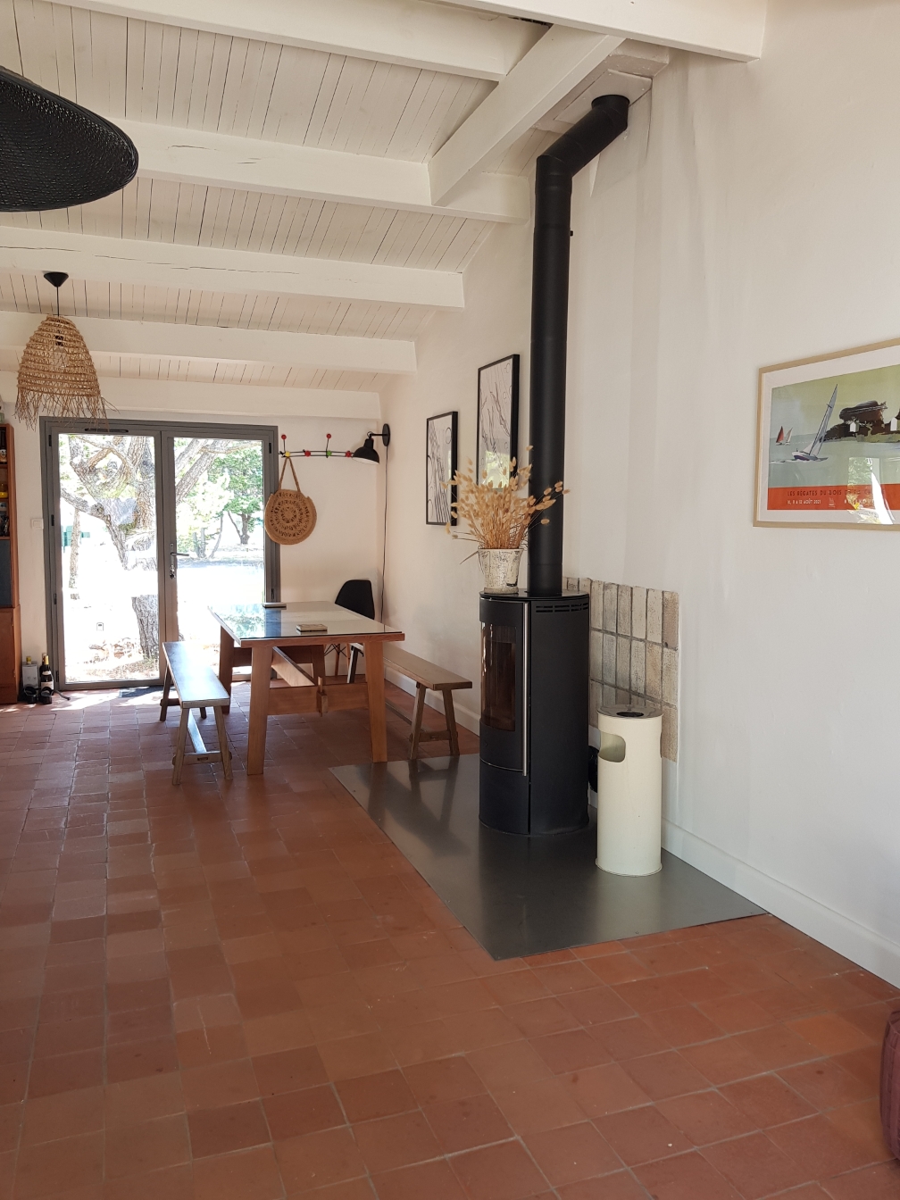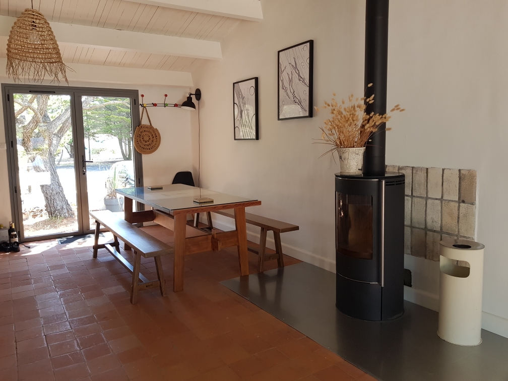 - Pièce de vie lumineuse avec son poêle à bois, créant une ambiance chaleureuse et conviviale