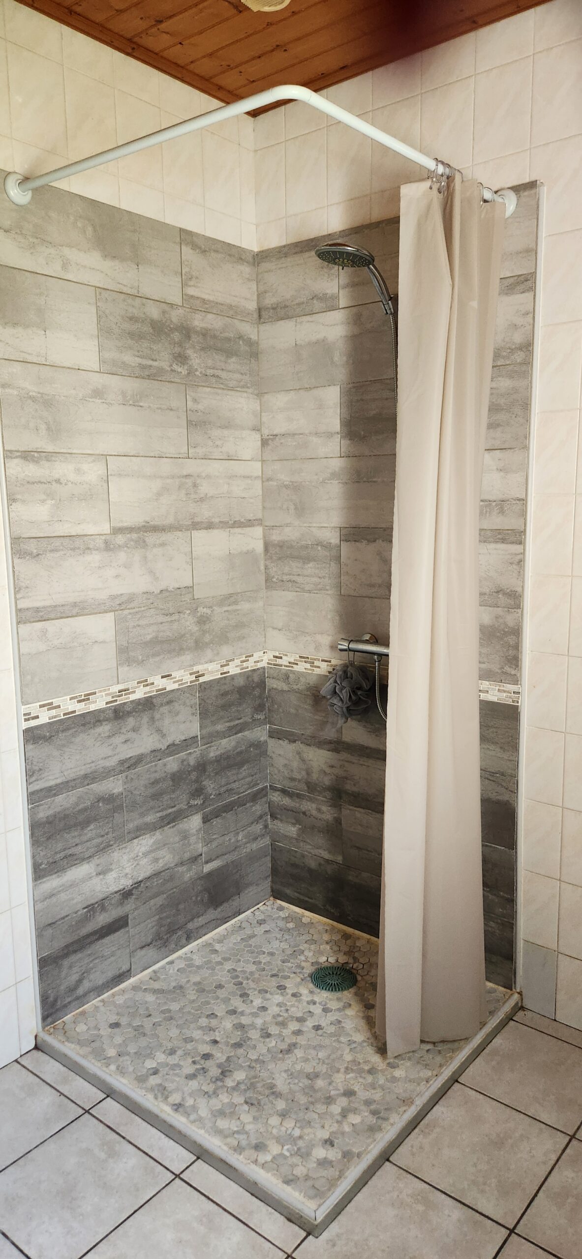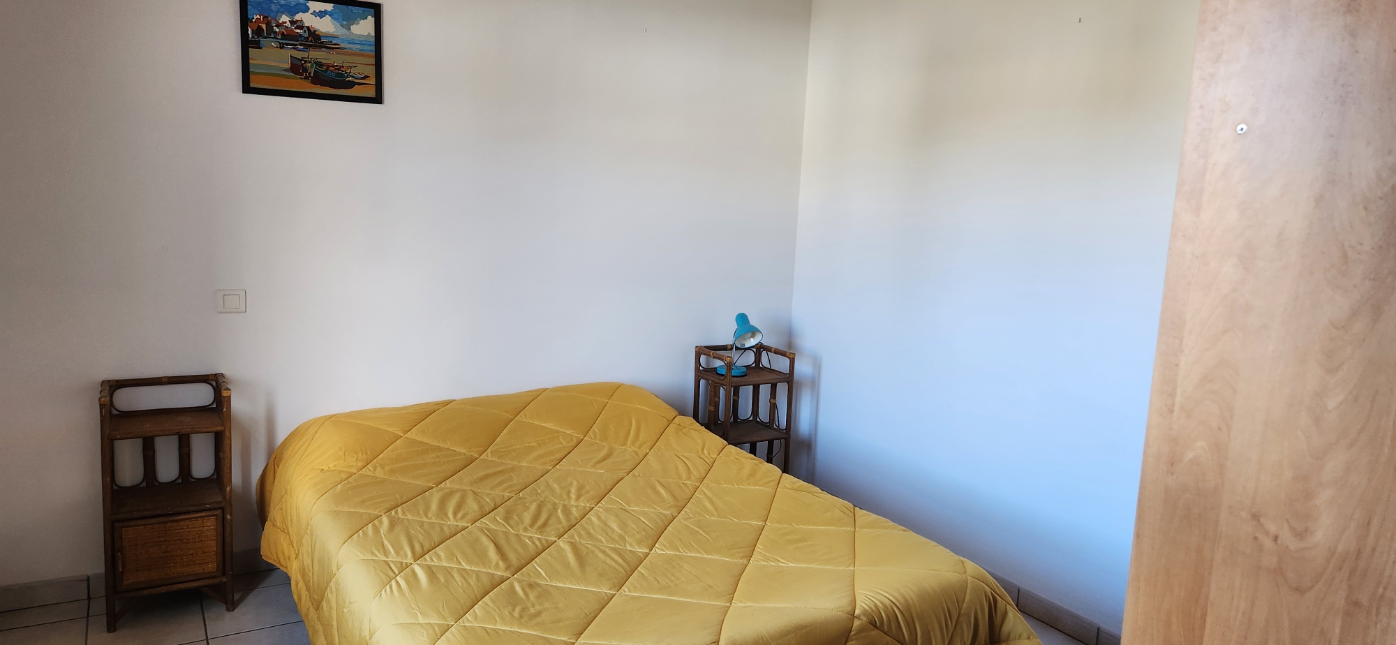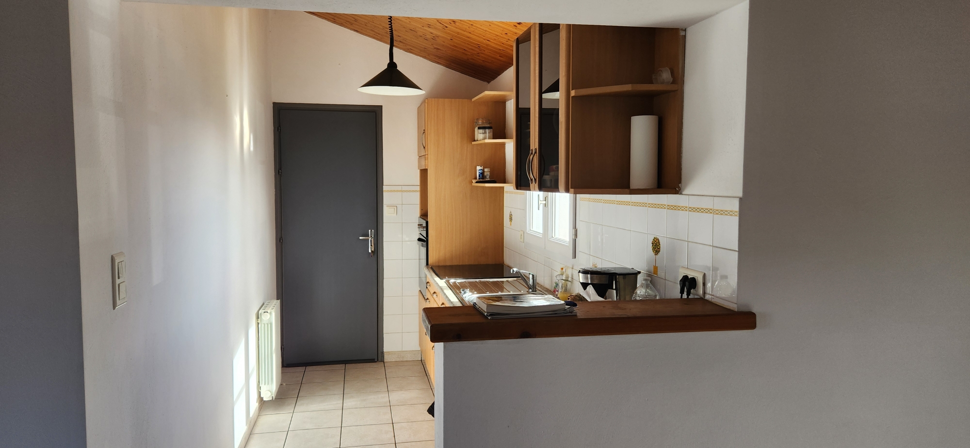 Salon-séjour lumineux avec cuisine ouverte, parfait pour les moments de convivialité, trois chambres, confortables, salle d’eau, WC indépendant